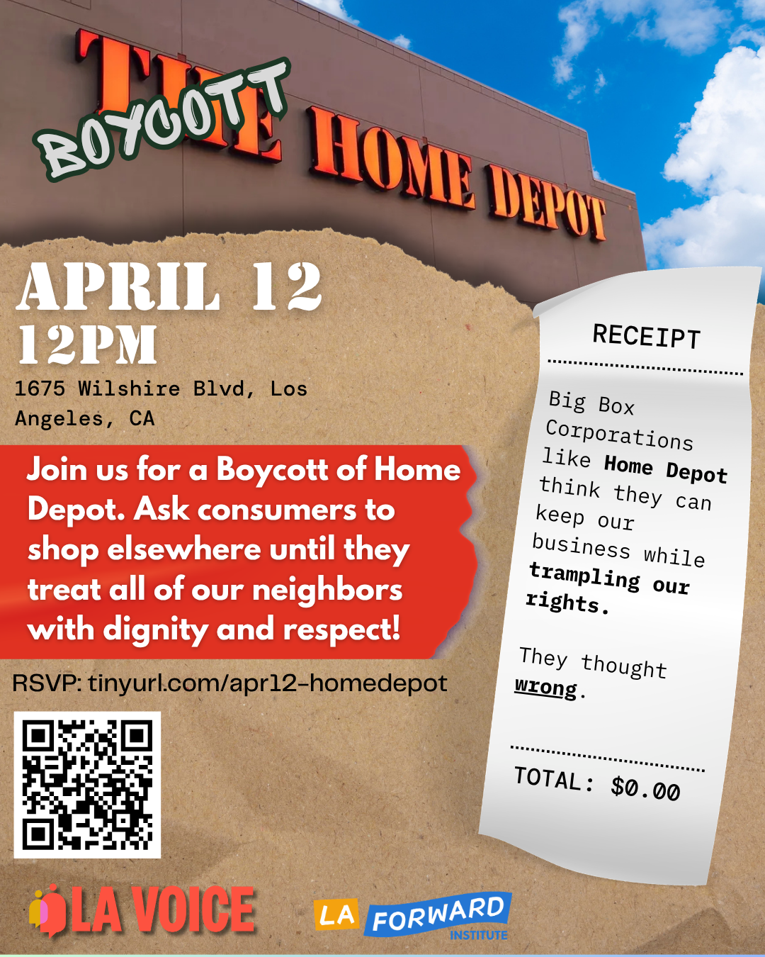 Corporations like Home Depot think they can keep our business while trampling our rights and allowing our neighbors to be kidnapped. Whether it's your first or 100th time at a boycott action, we welcome members of LA Voice, LA Forward Institute, and other allied organizations to help us inform neighbors that we should be boycotting Home Depot. We’ll be organizing at a Home Depot parking lot to let customers know we’re not shopping at places that don’t respect us, and encourage them to do the same!