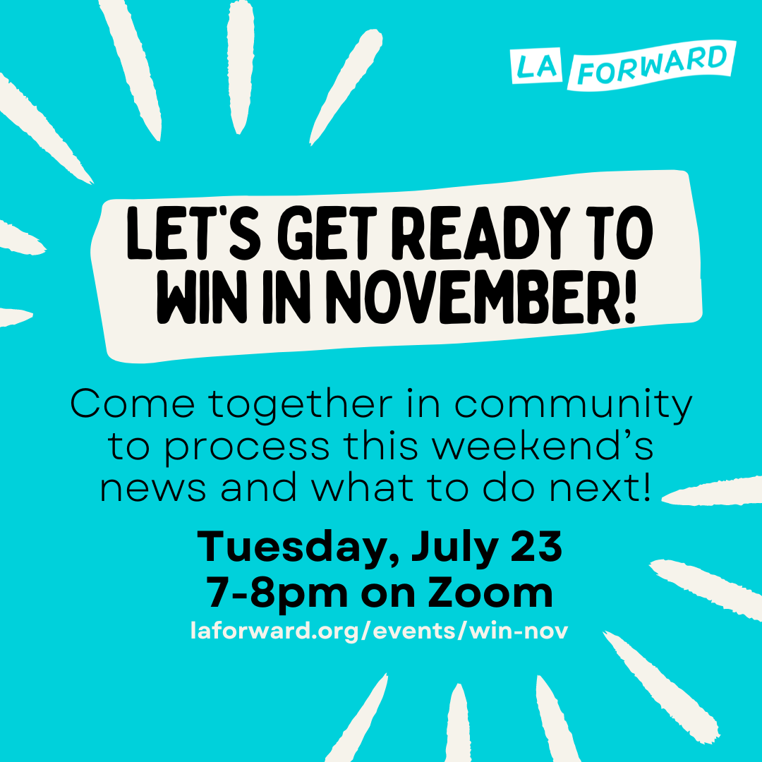 Join LA Forward as we talk about what the rest of the presidential election looks like and how you can support effective grassroots groups in swing states. Because we know what happens at the federal level has a massive impact locally. And we can’t stop there. There are dozens of important races and ballot measures up and down the ballot in our cities, county, and state and we’ll provide a roadmap for how you can be involved locally.